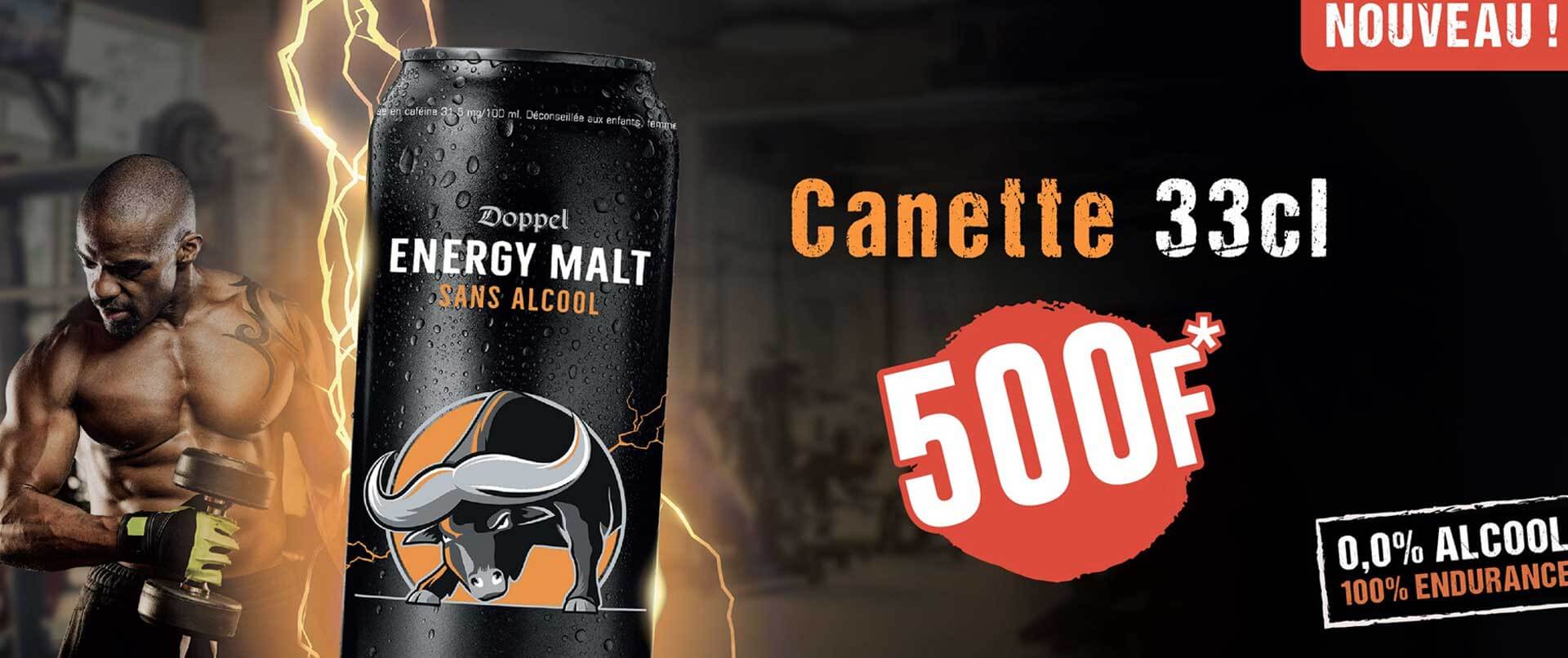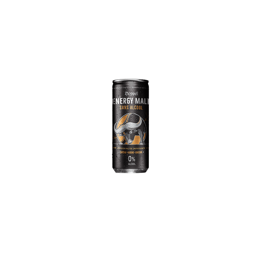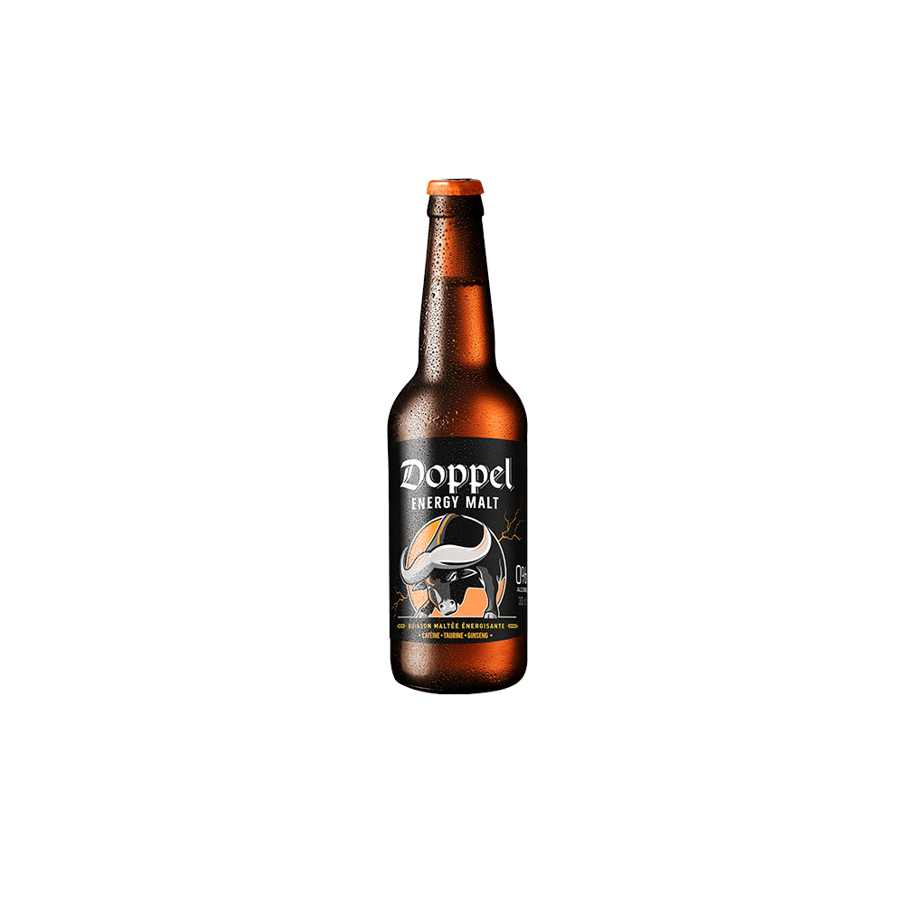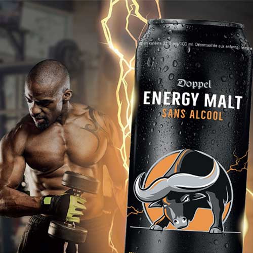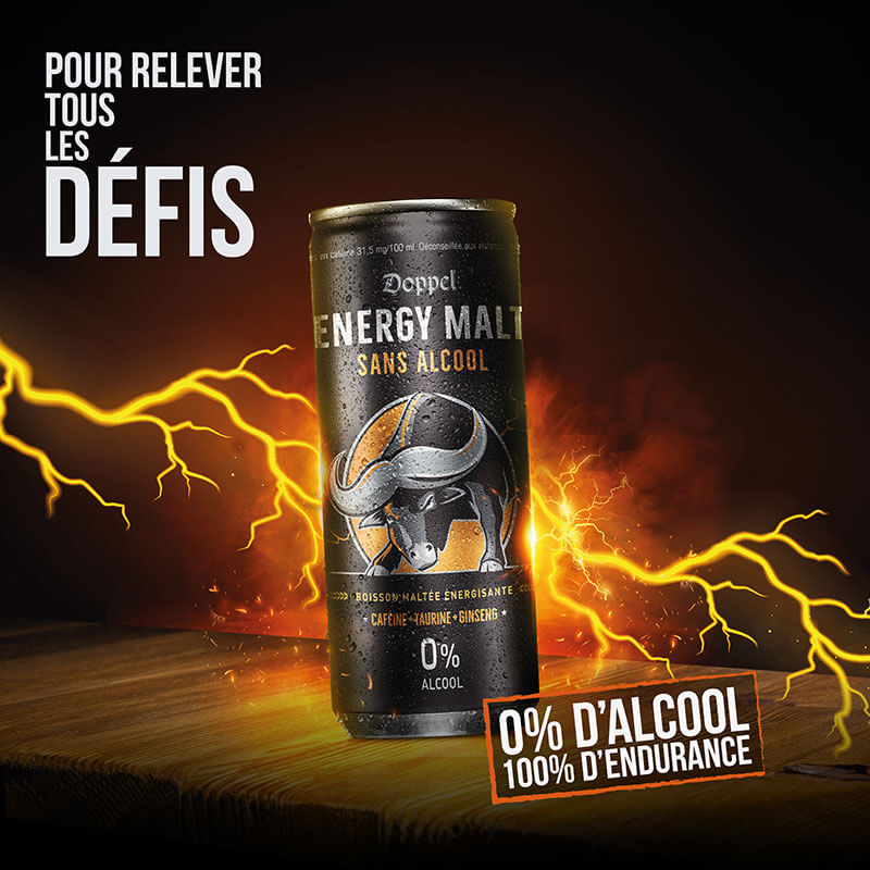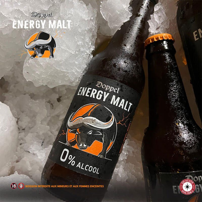 DOPPEL ENERGY MALT est la nouvelle marque de boisson énergisante de la SOLIBRA, avec 0,0 % d'alcool et 100 % endurance, composée de caféine, de taurine et de ginseng.