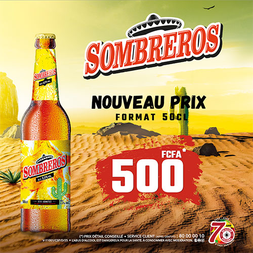 SOMBREROS, est déjà disponible en format 50 cl dans tous vos points de vente habituels au prix détail conseillé de 600 Fcfa la bouteille de 50 cl verre consigné.